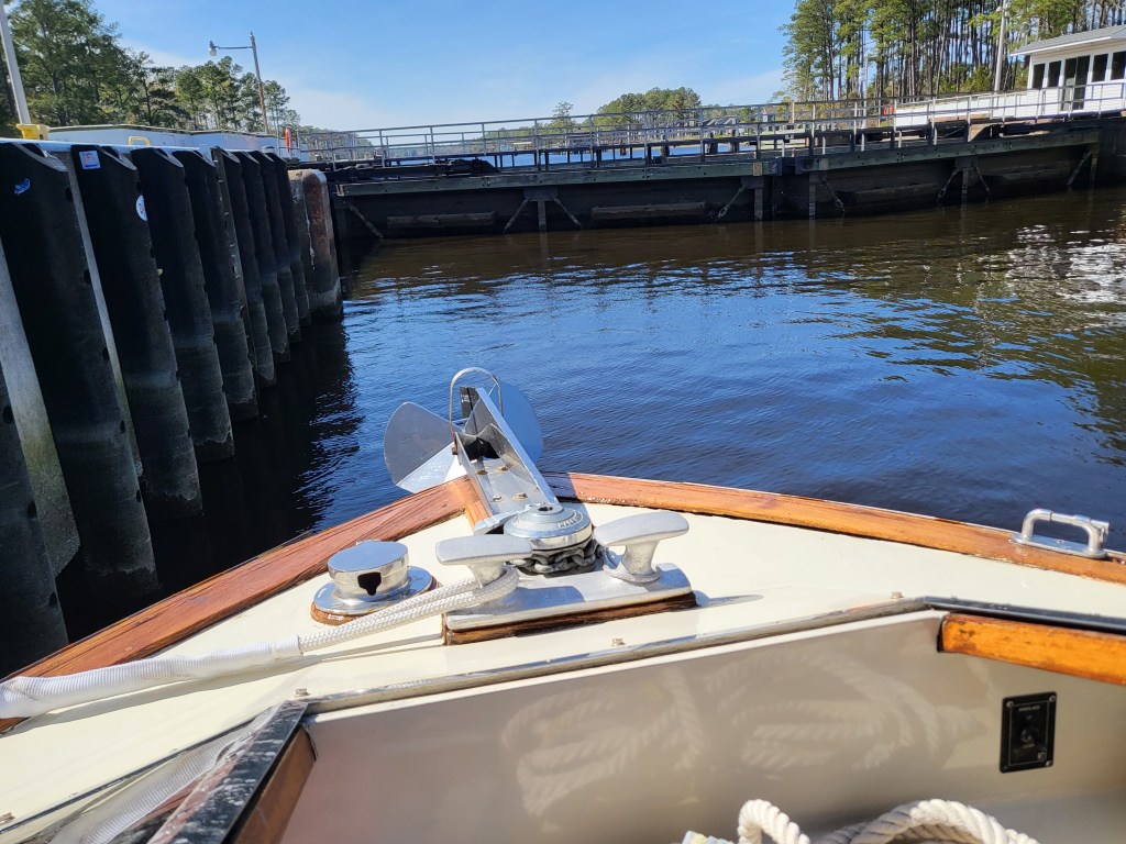 Back in the ditch of the ICW we now had to calculate time and distance to get through a series of draw bridges and a lock to our destination for the day at the north end of Norfolk harbor. The densely populated area south of Norfolk and Virginia Beach has a number of bridges that cross the ICW. For the last three decades, all new ones are built to a fixed height of 65 feet, which meant they would be no factor for us, or the commuters driving across. Unfortunately, there are still draw bridges and to facilitate road traffic, they limit openings to either once an hour or every 30 minutes depending on their posted rules. It became imperative that we hit the first bridge with an opening on the hour at exactly 2:00 pm. That gave us 30 minutes to go five miles to the next bridge opening at 2:30, followed by a 3.5 mile run to the Great Bridge lock at 3:00 pm. If we made the first bridge on time, we could make it to the Norfolk Yacht & Country Club by 4:00, before the Dockmaster left for the day. If we missed the first bridge opening by even five minutes, we would be set back an entire hour. We cruised slowly through the world-famous town of Coinjock and kicked Eleanor back up on plane to get to our bridge opening.