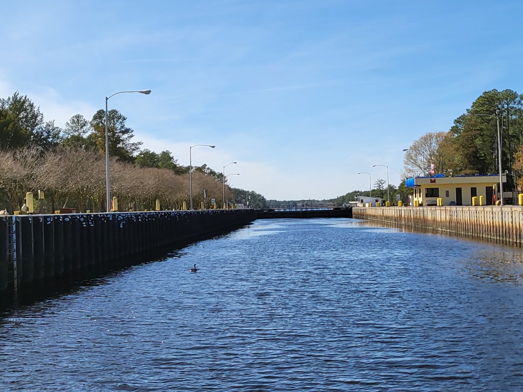 Everything went as planned and we made it through all the drawbridges and into the Great Bridge Lock at 3:00. The lock is unusual in that unlike most locks, it isn’t to move vessels up or down in water level. The purpose is to keep the salt water from the Atlantic Ocean, Chesapeake Bay, and the Elizabeth River from Norfolk from contaminating the fresh water Currituck Sound of North Carolina. Plants and animals prefer either fresh or salt water environments so this “guard lock” is needed to impede water flow through the man-made canal connecting the two different ecological systems.