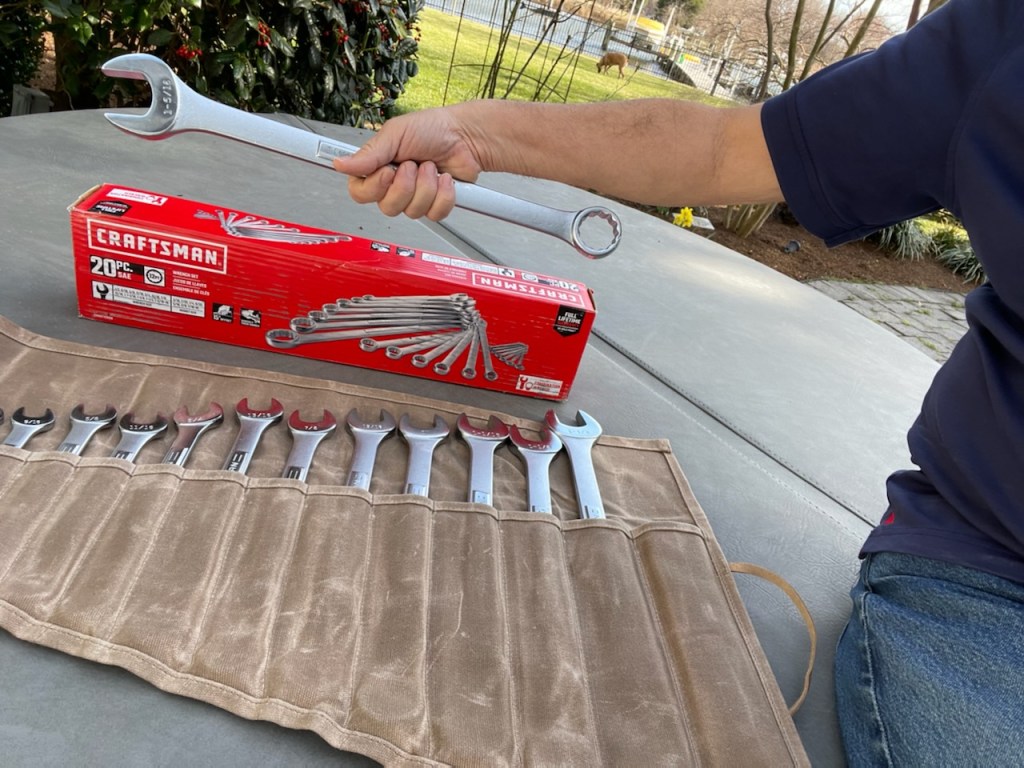 A man and his wrenches For my birthday I had asked Terese for a set of really big wrenches. Craftsman. 20 sizes all the way up to 1 5/15” and the entire set weighed in at over twelve pounds. The problem with having new tools is the desire to use them. Instead of starting with the obvious, I went right for the wrenches and started bleeding the fuel system. Loosening a bolt on the downstream side of the fuel filter I pushed on the pump and fuel trickled out, just as it should. Not the problem. I tightened everything back up and took two steps back. Go back to the basics, I thought. I climbed down into the engine compartment and went to the fuel manifold to check valve alignment. The starboard engine fuel valve was closed. Who the hell did that?