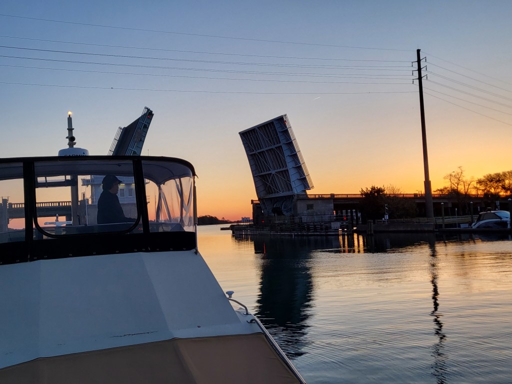 “Hey everybody, bridge opens in ten minutes and then will stay closed for an hour. We are getting underway. Kurt, can you disconnect shore power. Terese, and Michelle start pulling fenders and lines, leaving bow, stern and the red spring line.”